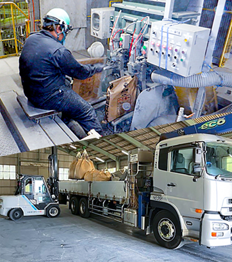留萌SS(サービスステーション)にて粉粒状のセメントを袋詰めして製品化しています。